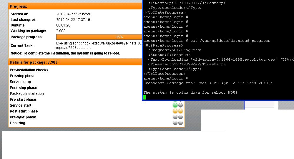 From my point, this is purely a timing issue. Webadmin polls periodically to get the current install status. If the install finishes fast enough (very fast hardware), or the polling takes too long (slow network), it won't be able to update the display in webadmin with the final steps completed. When I run the install locally, it usually displays all the steps. Occasionally on a virtual machine, or if I run the update on my home ASG from the office, the progress might not get to the end, before the unit reboots. This is the same in 7.5.