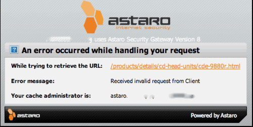 2010:04:24-10:18:58 mercury-1 httpproxy[19571]: id="0002" severity="info" sys="SecureWeb" sub="http" name="web request blocked" action="block" method="GET" srcip="10.10.0.85" dstip="" user="" statuscode="400" cached="0" profile="REF_WmkYWjKFWB (Internal Networks)" filteraction=" ()" size="4641" time="0 ms" request="0xeaea14b8" url="/products/details/cd-head-units/cde-9880r.html" exceptions="" error="Received invalid request from Client"