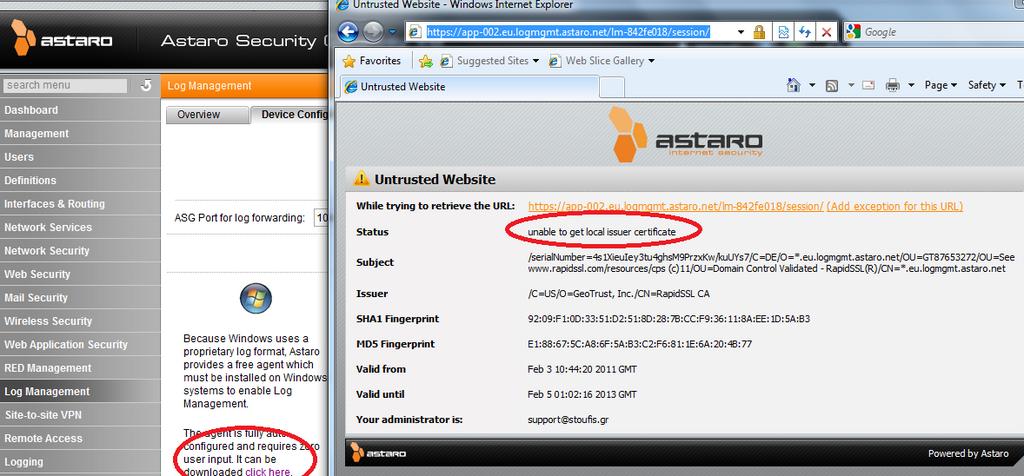 When trying to download the log managment software for my client (OS 7 64 bit with ie 8) I have to manually add the exception (pic attached) and then it seems that the page is not valid (Attached)