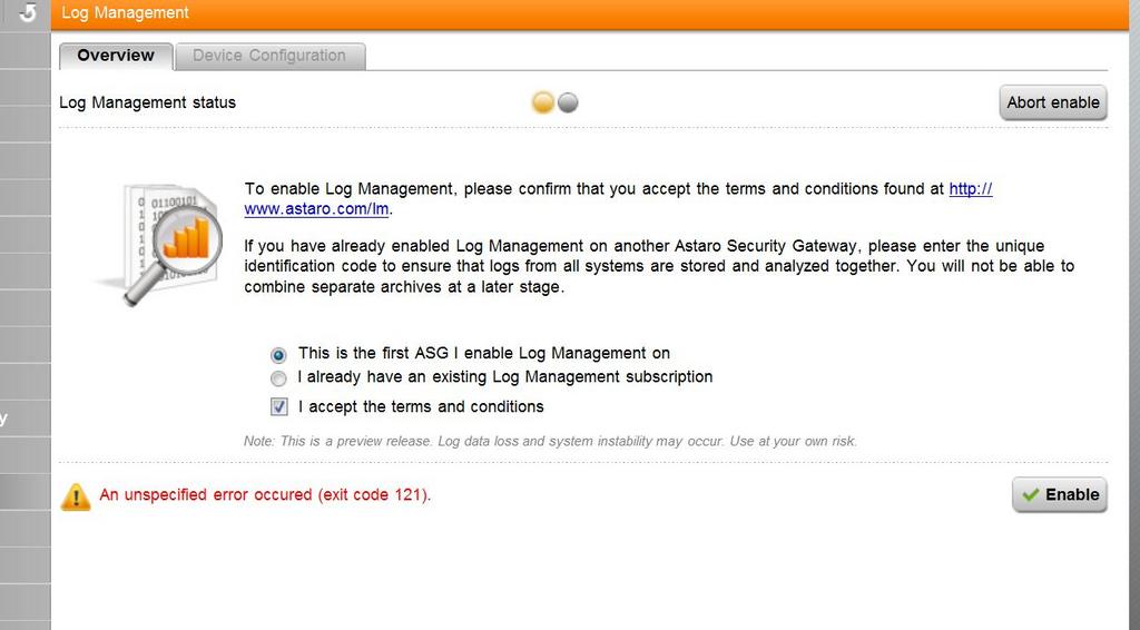 This isn't a bug, just an observation. Its always assumed that ASG is going to be an Edge firewall. I am testing my beta ASG behind another ASG till the beta gets a little stable. However, I couldn't enable log management till I enabled SSL access for the firewall. I did get an unspecified error code 121