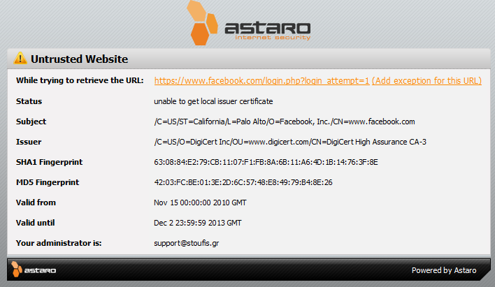 2011:03:05-13:53:52 stuffman httpproxy[8535]: id="0002" severity="info" sys="SecureWeb" sub="http" name="web request blocked" action="block" method="GET" srcip="192.168.2.1" dstip="69.171.224.13" user="" statuscode="403" cached="0" profile="REF_CnNPwVRtng (Internal Users)" filteraction="REF_DefaultHTTPCFFBlockAction (Internal Users)" size="6292" request="0xec37d250" url="www.facebook.com/favicon.ico" exceptions="" error="unable to get local issuer certificate" country="United States" category="195" reputation="neutral" categoryname="Social Networking"