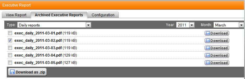 Is anyone having problems downloading any archived executive reports from the archived executive reports tab? When I select individual reports to download (checking the box and selecting the download button on the right) the reports will not download. If I chose to have the reports compressed (ZIP file) and downloaded the reports will download with no problems. I have tried this with both Firefox and IE. I have attached a screen shot showing the area were I am trying to download the reports.