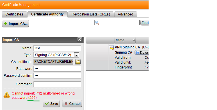 The error message when trying to import a signing CA is not very user friendly. What is 256? (i guess the relevant error code?)