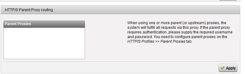 [SIZE="5"]You need to configure parent proxies on the HTTP/S Profiles >> Parent Proxies tab.[/SIZE]