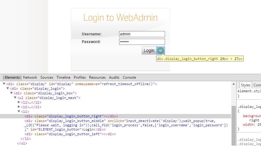 Clicking on the green arrow in the "button" on the WebAdmin login screen does nothing while clicking in area of the Login text proceeds with a login attempt.