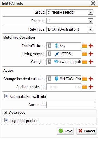 I have been having a problem with my OWA dnat rule. For some reason it seems to stop working when I put in DNS server from my domain as DNS forwarders in Astaro or when I put in a request routing  for my domain to point to my DNS servers. I need request routing in place for Single Sign On to work with my AD.