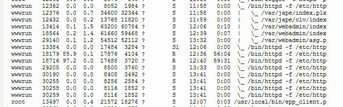 I notice the following high load in the wwwrun section of top.  I have 4 GB RAM and a quad core Xeon and as this has been continuous for over 2 hours, thought I would submit it.  Have no idea why the high processor usage.  RAM usage is 22%