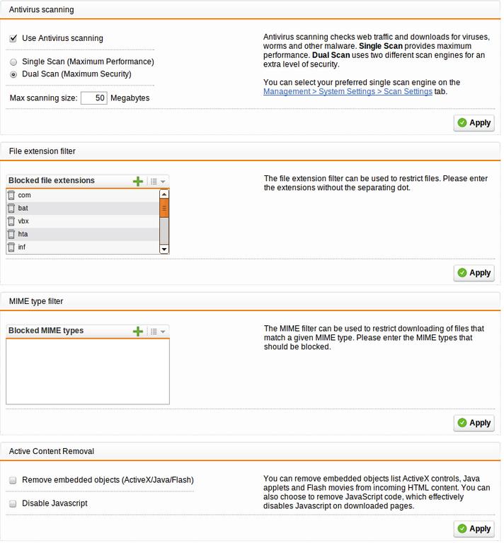 Web filtering is turned on. It's only doing AntiVirus scanning, no categories blocked.