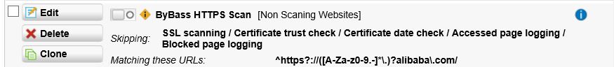 • I'm a bit confused by your pictures and log line.  We don't see alibaba referenced in the log line.  Your picture shows the middle of adding a DNS Host to the Skiplist (did you Save and Apply?), but this is for aliexpress.com instead of alibaba as you have in your Exception.