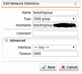 We use the 'DNS Group' Definition to define specific computers which need to use the Agent for authentication (these groups themselves go into a Network group which is tied to it).  The DNS group works fine resolving the IP (or IPs) associated with the DNS name, however the problem is that it doesn't revert to 'unresolved' after the DNS record no longer exists.  After a week, our PCs DNS records will fall off the system, but the UTM will still show it resolving to whatever those IPs were when it was online.  This is causing problems because then other computers will come along and pick up those IPs and the system will think they need to use the Agent and won't let them out, because they don't have the Agent installed (we only use the Agent for our Mac computers).    I have tried adjusting the 'Timeout' settings and the interface binding on the DNS Group record, and nothing makes it give up the IP(s) except to change the Hostname to something else, then change it back.  I even tried flushing the system DNS cache to no avail.