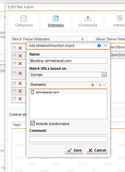 • Try backlist object under Edit Filter Action / Block These Websites.  Add rahmatravel.com in Domains.  This should work.