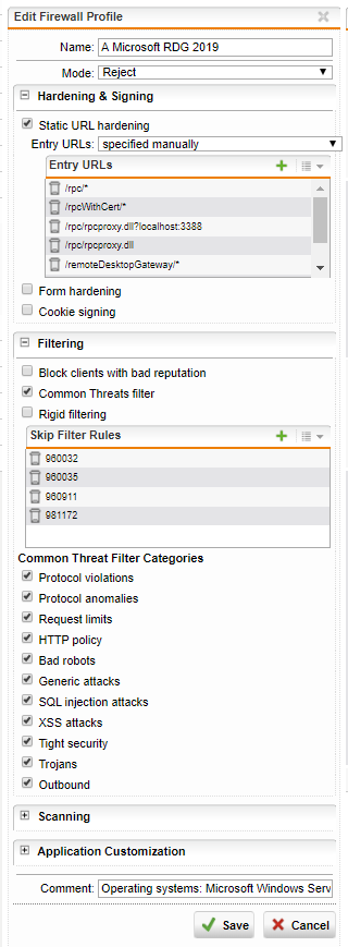 - Static URL hardening with these entries: /rpc* - /rdweb* - /RDWeb* - /rpcWithCert*