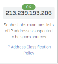 This message appears when some user hosted on my server tries to send mails to a server that use your service/products. I'm telling them, that the fault it's on the firewall from Sophos, and they have to consult with their administrator to try to fix it, because as I am not your client, I doesn't have any right to unblock my own IP. Weird true? This "solution" was suggested by one of your support staff.