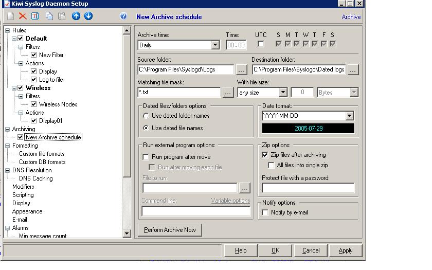 • Velvetfog, why don't you just use the builtin archiving in Kiwi? See my attached screenshot for an example. I have it run every night since my daily syslogs are over 400MB in size.