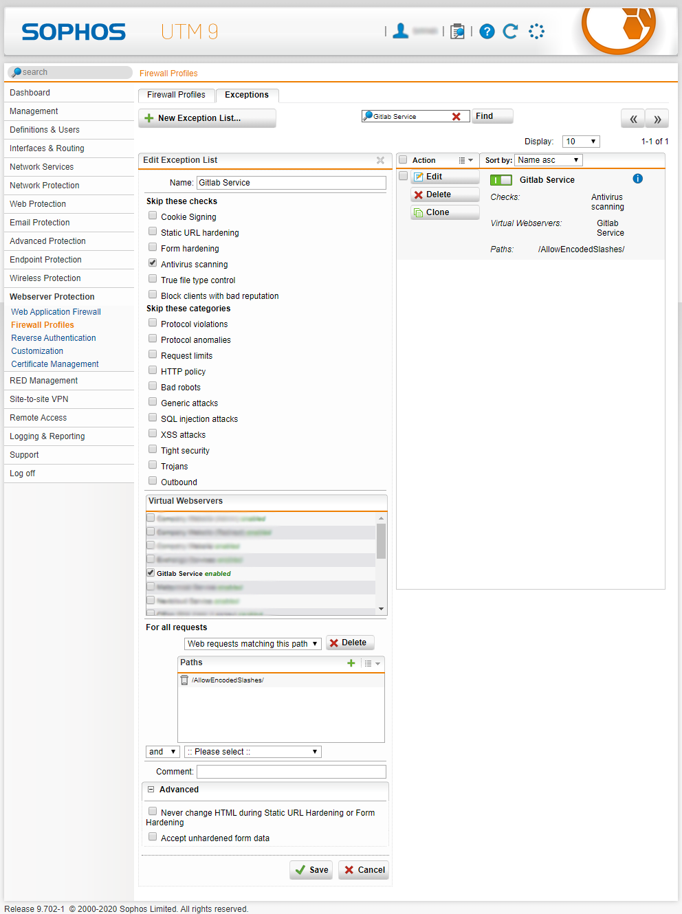 This way, the only thing my customer has to do when I wants 'AllowEncodedSlashes On' enabled for a virtual server, is create an exception under "Webserver Protection" > Firewall Policies > [Exceptions]. The param of the exception needs to be excluding anti-virus for the path /AllowEncodedSlashes/