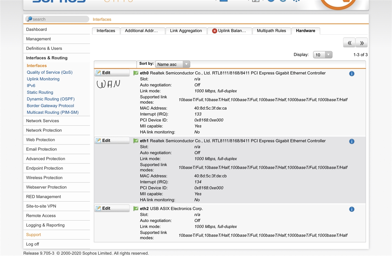Hinter der UTM befinden sich zwei dedizierte NICs, eine onboard für mein NAS und eine USB 3.0 to Ethernet für meinen Raspberry auf dem Nextcloud läuft. Auf der UTM betreibe ich das normale Firewall Regelwerk um den Zugriff auf mein NAS zu steuern und die WAF für den Zugriff auf Nextcloud aus dem Internet.