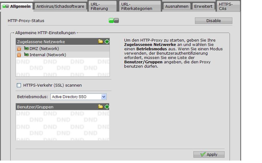 Web Proxy im ActiveDirectroy SSO Modus aktiv. Für die Office Rechner sind bestimmte Webseiten freigegeben. Die Rechner in der DMZ werden nur durch Blacklists beschränkt. Das Funktioniert alles ohne Probleme.