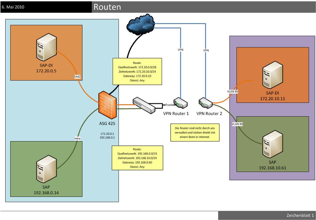 Um die Hochverfügbarkeit sicher zu stellen verlagern wir Teile der DMZ und des Intranets in ein RZ (lila).