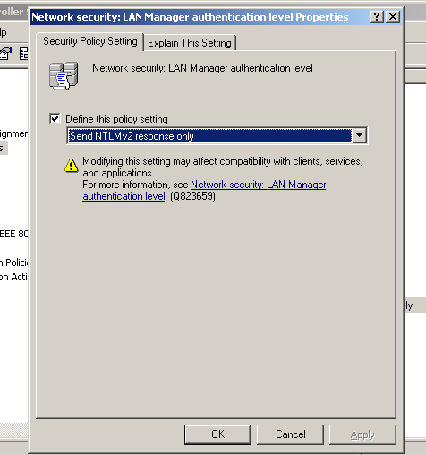 Dort solltest du nach dem Eintrag Netzerkzugriff:Lan Man Server AUthentifizierungsebene suchen und die Option "nur NTLM_v2 Antworten auswählen...." das brachte bei mir u.a. nach einem Neustart den gewünschten Effekt..." :-)