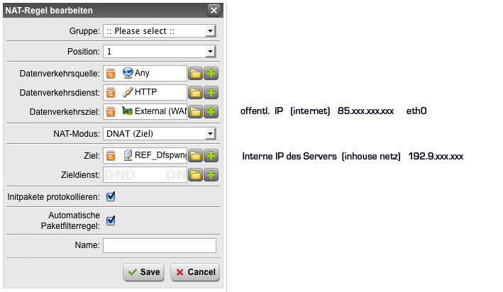 Wenn du die DNAT Einstellungen so (nur mit den Änderungen von diesem Post) machst wie in Post 7 machst, kannst du den Haken bei 'auto Packet Filter Rule' machen dann hast du dir die Regel gespart.