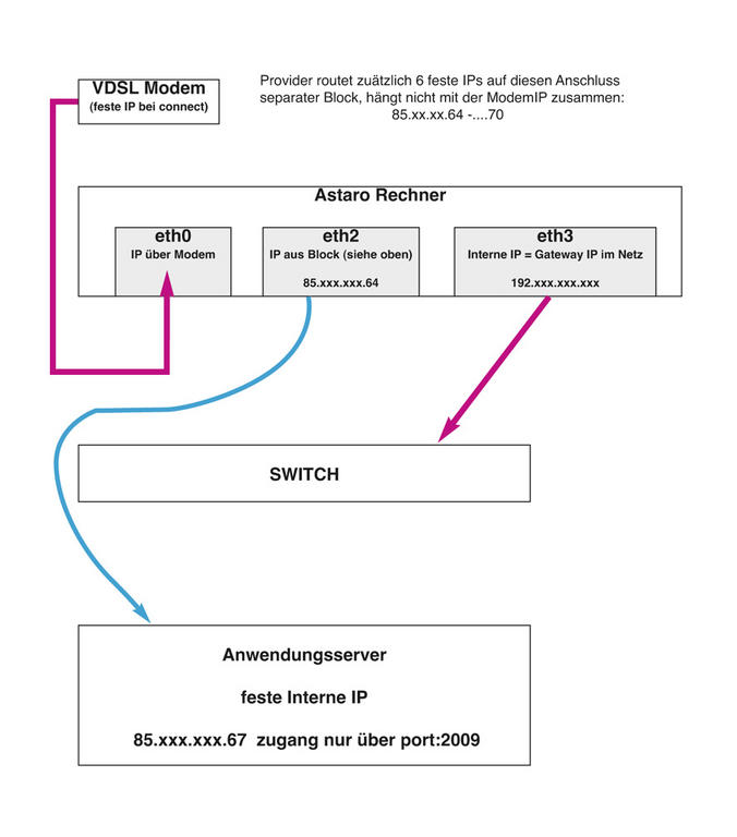 Die ASG läuft auf einem rechnern mit 4 netzwerkanschlüssen. ich dachte mir es so zu konfiguriern das anfragen der festen öffentlichen ip dann an einen spezielelen anschluss weitergeleitet werden und ich diesen dann auf dem serverals gateway einstelle.
