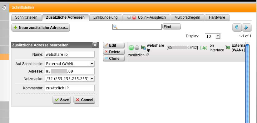 - die zusätzlichen IP Adressen als 'Additional Adress' auf das eth0 Interface konfigurieren
