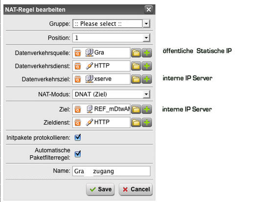 Leider läuft das aber nicht, di IP lässt sich über das internetz zwar anpingen aber sonst nichts. Das zweite problem ist dass die Anwendung auf die zugeriffen werden soll Port 2009 braucht, sobald ich in der NAT regel das einstelle geht kein Internet mehr, obwohl die NAt regel ncoh nicht aktiv gestellt ist.