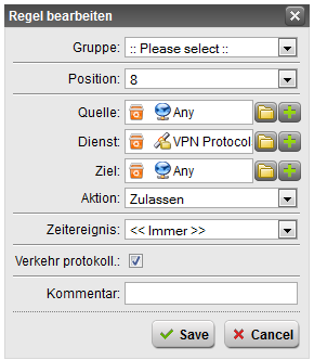 ich habe hier in einem Netzwerk eine Astaro im einsatz. Auf einen der Arbeitsplätze ist ein Openvpn-Client eingerichtet, der sich durch die Astaro auf einen Openvpn-Server verbinden soll. Wenn ich in den Paketfilterregeln eine Regel Any-Any-Any erstelle klappt das auch. Leider gelingt es mir nicht die passende Regel für diese VPN-Verbindung zu erstellen. Im Anhang sieht man womit ich es versucht habe. Leider wir der Verbindungsversuch aber immer noch geblockt:
