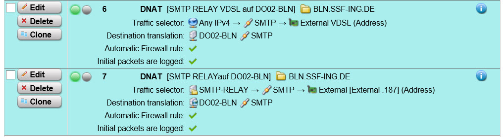 Wir bekommen unsere Mails per SMTP von einem Provider. Dafür habe ich ein NAT definiert, welche SMTP-Pakete von bestimmten Absender auf meine internen Mailserver umsetzt. Dies funktioniert einwandfrei. Jetzt haben wir eine neue Leitung (VDSL) hinzugenommen (Lastverteilung, Ausfallsicherheit). Ich habe eine zweite identische Regel für die neue Leitung angelegt. Von einem eigenen externen Server kann ich problemlos Mails empfangen. Die Pakete von meinem Provider hingegen werden "gedropt" [:@]