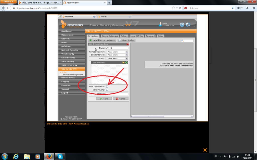 • *kopf an Tisch haut* wie in dem Viedeo das du mir ja noch mals geschickt hattest, wenn man es den mal bist zu ende anhört...und nicht glaubt das man schlauer ist als der Autor Zitat:"Please notice that if you do not klick Auto packet filter and don´t configurate by your one, the Tunnel will come up but no traffic between the to ASG is possible"