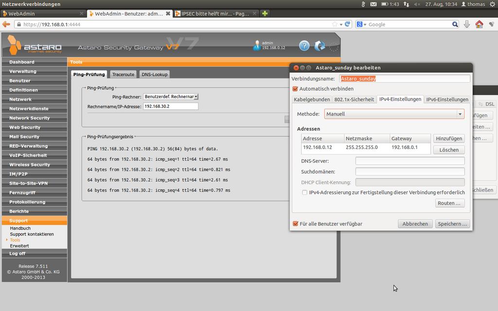 - IPSec Tunnel steht wieder, von ASG_A kann ich auch das ext. und inter. interface der ASG_B Pingen...aber so bald ich meine laptop direkt an eth3 (int.) anstecke und versuche die andere ASG zu Pingen, geht garnix. Fotos sind im Anhang...das ganze ist immer mehr en BlackBox für mich...
