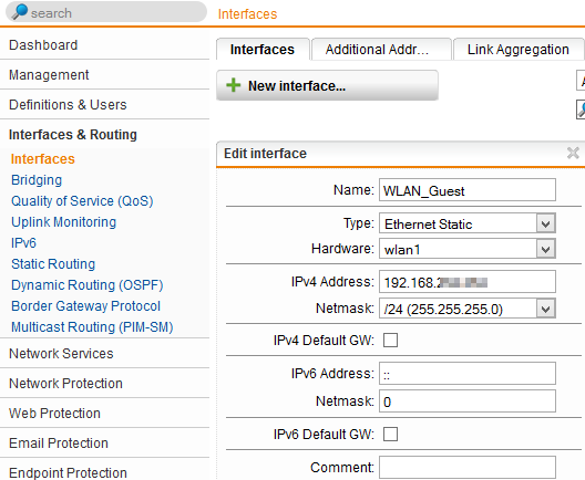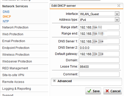 • Wenn es um ein separates Netz geht: Auf der UTM einen neuen DHCP-Server anlegen, der an die Schnittstelle wlan1 gebunden ist (muss als Schnittstelle angelegt sein). Beispiel: