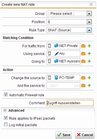 IPSec-Verbindungen stehen, die Außenstellen sind mit Hilfe entsprechender SNAT-Regeln (s. Anhang als Beispiel) auch erreichbar.
