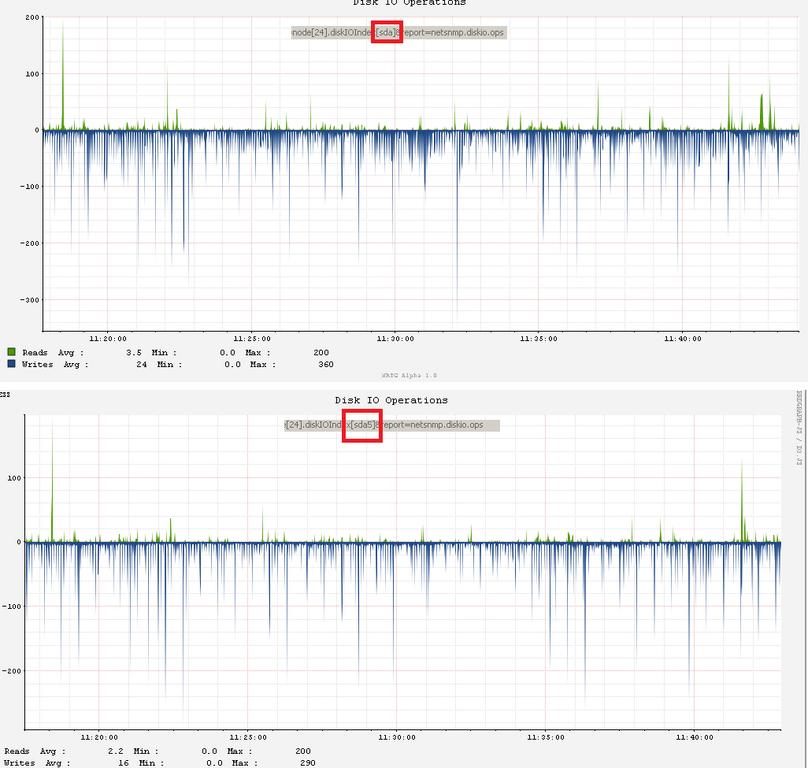 Ich habe mal die IO Werte der beiden Partitionen mitgeloggt, die am intensivsten genutzt werden. Man sieht, dass hier permanent geschrieben wird (blau). Und zwar oft gleichzeitig und mit IO Werten von 200-300 IO/s. Das packt keine einzelne SATA HDD ohne Latenzen.