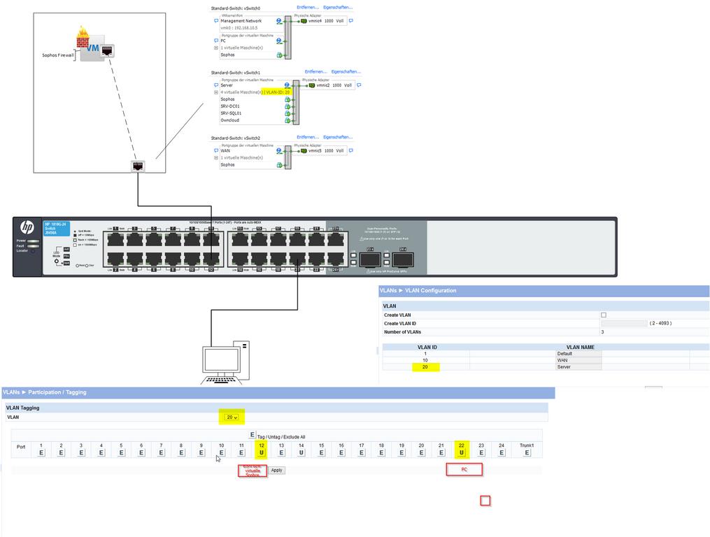 Ich habe auf meinem Switch (HP1810-24G) 2 Ports in das VLAN 20 Untagged aufgenommen. An diesen beiden Ports ist zum Einen der physische ESXi Adapter angeschlossen, welchen die Sophos über ihren vSwitch verwendet und zum anderen ein PC.