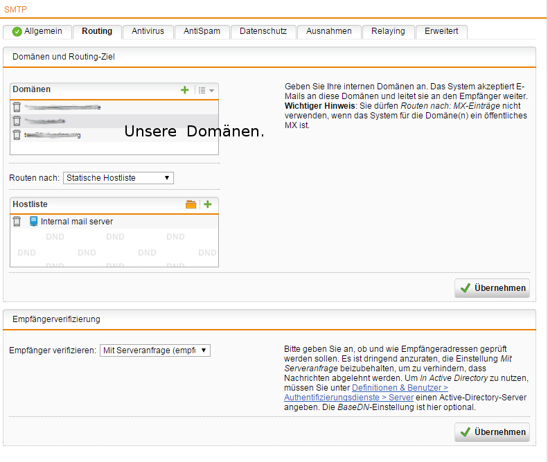 In dem Fall würde ich mal anfangen, die Domains zu konfigurieren und den/die Mailserver einzutragen, an den/die die Mails weitergeleitet werden sollen.