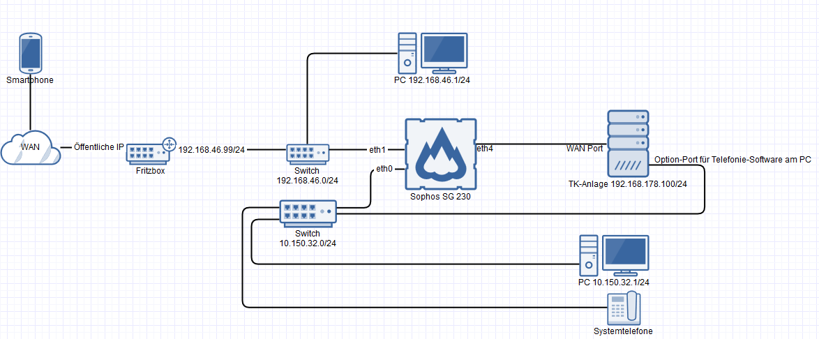 Wenn die TK Anlage vom Internet aus erreichbar sein soll, müssen noch NAT Regeln hinzugefügt werden. Es sei denn die Smartphones benutzen VPN oder sind in einem anderen Netz der Sophos. Dann müssten entsprechende Firewall Regeln angelegt werden.