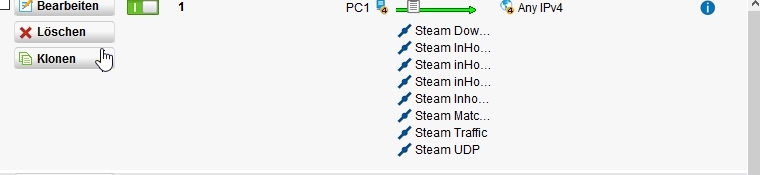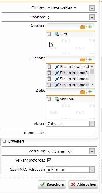 • So ich habe jetzt eine Firewall Regel erstellt nochmal mit allen Steam Ports für meinem PC. Funktioniert einfach nicht. Testweise habe ich auch mal die Firewall des Kabelmodems deaktiviert, funktioniert auch nicht. Im Firewall-Log steht doch das die Anfragen akzeptiert werden.... aber ich bekomme einfach keine Verbindung auf meinem Client. Sonst habe ich keine weiteren Geräte die die Verbindung zu Steam blocken könnten. Hat auch vor der Installation von Sophos funktioniert. Und ja die Mac Adressen habe ich unkenntlich gemacht, sind doch auch nicht weiter wichtig?  Wie du siehst habe ich die Position 1 gewählt, und auch natürlich die Firewall Regel aktiviert :D. Die ganzen Dienste für Steam habe ich auch erstellt. Wie gesagt im Firewall Log steht ja das das Paket akzeptiert wird. Bekomme aber keine Verbindung.