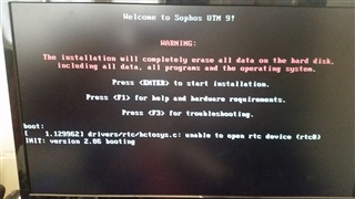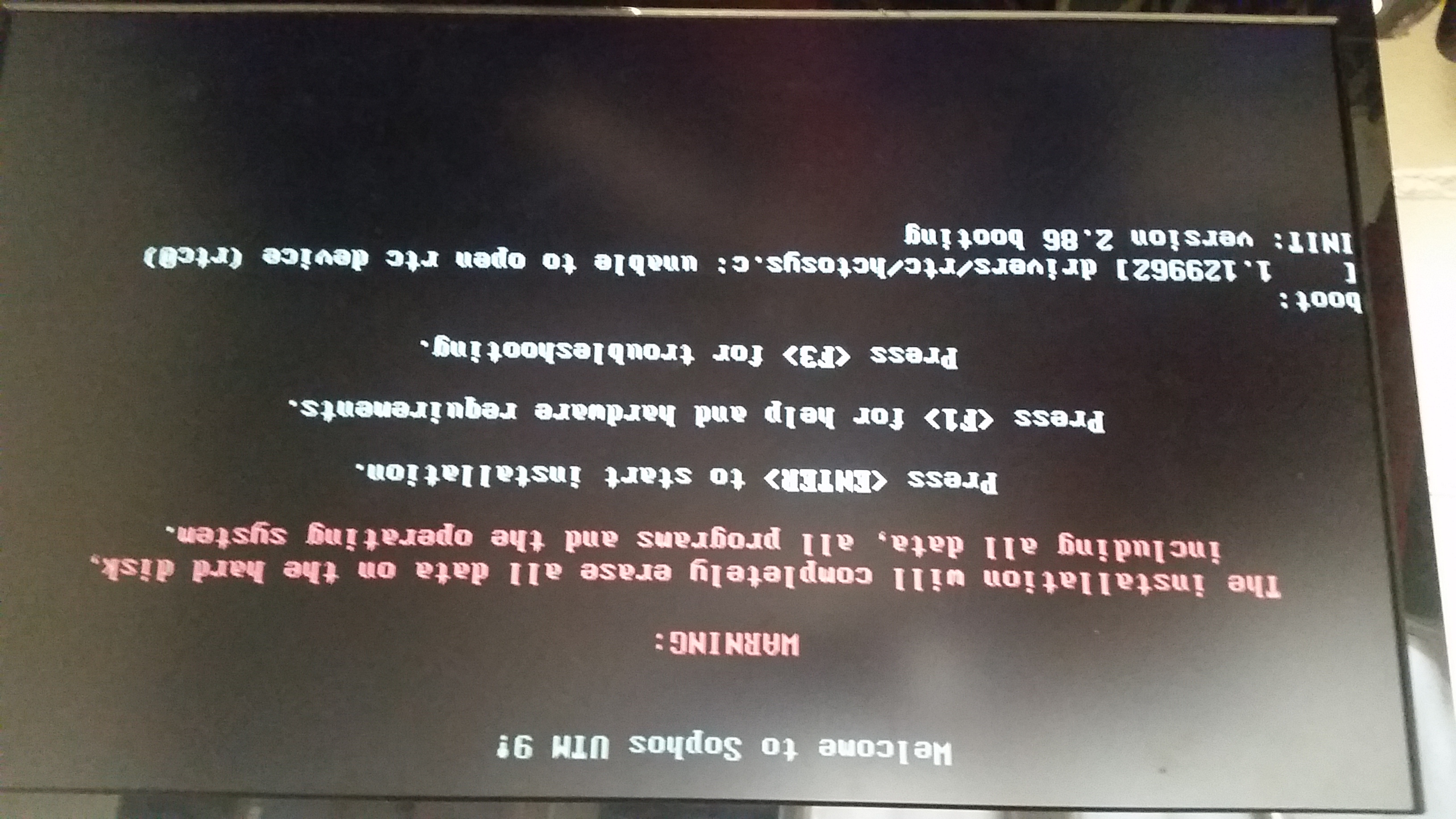 Ich habe von meinem Onkel eine Ausrangierte Astaro ASG 220 in der Revision 4 bekommen. Da es ein Kundenmodel war, ist die Platte natürlich formatiert. Nun wollte ich mir die UTM 9.4 auf der Appliance Installieren. Soweit bootet das Gerät auch und sehe den Ladevorgang. Nach aber etwa 5 Sekunden bricht er ab und bringt mir die Meldung.