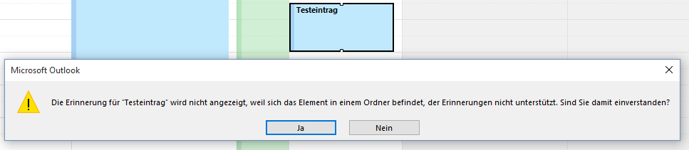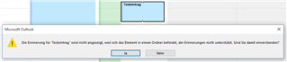Es erscheint die Meldung: "Die Erinnerung für XY wird nicht angezeigt, weil sich das Element in einem Ordner befindet, der Erinnerungen nicht unterstützt. Sind Sie damit einverstanden?"