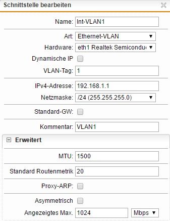 Das interne Interface ist eth1. Dort sind 2 Interfaces vom Typ Ethernetet VLAN angelegt.