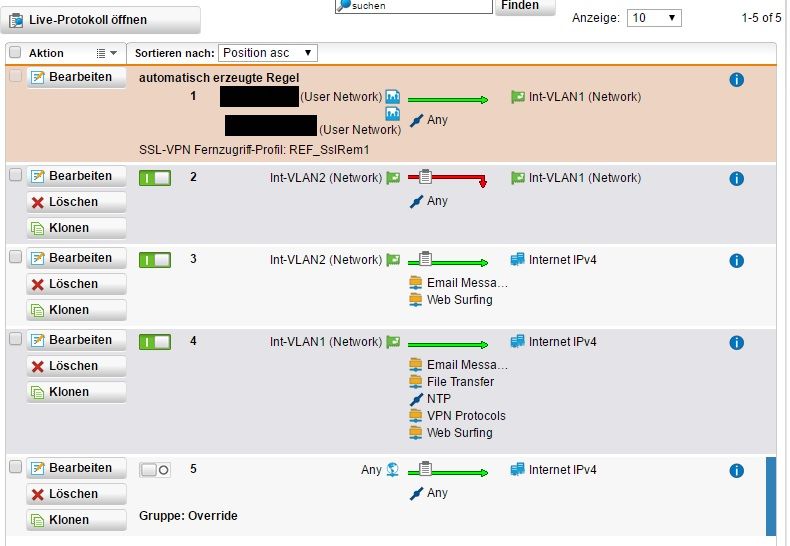 Daher vermute ich wie meine Vorrednerin K.N. das ihr irgendwo eine Regel habt, die sowohl Intenet als auch den Zugriff zwischen den VLANs erlaubt, z.B. Internes Netzwerk VLAN A > Web,Email, Filetransfer > Any. Richtig wäre Internes Netzwerk VLAN A > Web,Email, Filetransfer > Internet IPv4. Das Ziel Internet IPv4 bezieht sich nur auf öffentliche Adressen, sprich Internet. Danach sollte der Zugriff zwischen den VLANs nicht mehr möglich sein.