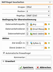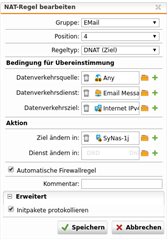 Das Forwarding ist per DNAT (Any -> entsp.Port -> InterNet) mit entsprechender Zielübersetzung auf den jeweiligen "Server" eingerichtet.