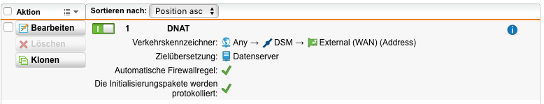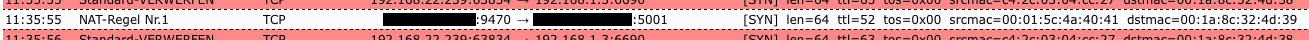 Ich habe hier im Beispiel eine NAT-Regel mit dem Port 5001 erstellt, im Log scheint dieser Zugriff von extern auf und wird auch (jedenfalls Augenscheinlich) weitergeleitet.