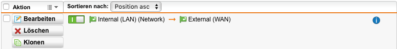 Es ist mir nicht möglich Dienste vom Internen Netzwerk, extern erreichbar zu machen. Die Firewall lässt keinerlei Anfragen durch, dieses Phänomen tritt leider bei allen Ports auf. Umgekehrt ist das ganze keinerlei Problem, die Firewall-Reglen von intern nach extern funktionieren wunderbar und meine Clients können auf den von mir freigegebenen Ports mit der Außenwelt kommunizieren.