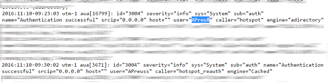 3. Hier noch ein Eintrag wenn sich der AD Benutzer "APreuß" anmeldet. Es gibt weder auf der Sophos UTM noch auf Domänencontroller einen Benutzer "APreuss".