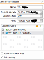 Auf der Sophos UTM habe ich mein LAN (192.168.10.0/24) und mein SSL VPN (192.168.15.0/24). Die UTM hängt WAN-seitig an einem Kabelmodem im Subnetz 192.168.5.0/24. Von meinem LAN/VPN möchte ich nun in über das VPN in das LAN der Fritz!Box (192.168.0.0/24) und umgekehrt zugreifen. Beide Subnetze habe ich in die Konfiguration der Fritz!Box und natürlich auch in die der UTM eingetragen. Wenn der Tunnel aufgebaut wird und ich einen Dauerping aus dem LAN sowie VPN in das Netz der Fritz!Box laufen lasse, sehe ich, dass erst der Ping auf dem VPN Netz beantwortet wird, dann abbricht und zeitgleich der Ping aus dem LAN beantwortet wird und dann so bestehen bleibt. Die Site-to-Site Übersicht in der UTM zeigt an, dass die beiden SAs für das Subnetz LAN und VPN aufgebaut wurden.