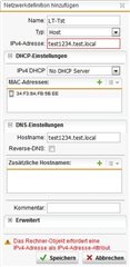 Ziel ist das ich einige Laptops als Hosts anlegen möchte (Um sie mit ihren MAC Adressen dem Filter für das WLAN zuzuordnen). Problem ist das die Host-Definition eine IP Adresse verlangt. Diese kann ich logischerweise nicht angeben da sie sich A: Ändert und B: die UTM überhaupt nicht für das Netz verantwortlich ist.