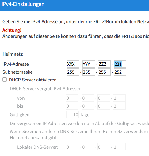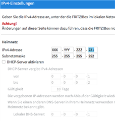 Damit kann die Sophos außer sich selbst nur die 192.168.1.9 erreichen, die Fritzbox nur die 192.168.1.222. Auf Grund des /30er Netzes kann die Fritzbox dann auch keine Route zu 192.168.1.10 definieren und spuckt entsprechende Fehlermeldungen. Da müsstest Du entweder die LAN-IP der Fritzbox entsprechend runtersetzen oder die WAN-IP der Sophos entsprechend rauf (wenn Du KEIN Bridgemode machen kannst). Oder auf beiden Geräten die Subnetzmaske auf 255.255.255.0, ein kleineres Netz ist wegen der gewählten IPs nicht möglich.
