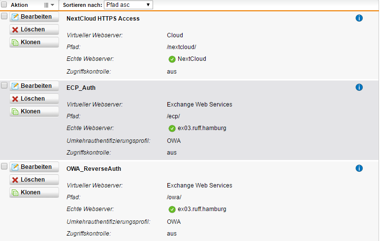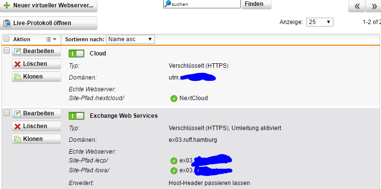 Ich habe bereits zwei "Echte" Webserver angelegt sowie die Virtuellen die auf die Entsprechenden Verzeichnisse verweisen. Dummer weise kann ich im NAT nur den einen oder den anderen Server via 443 erreichbar machen.